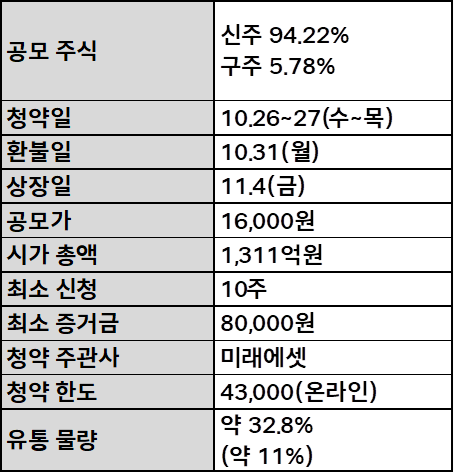 2. 상장일 유통 물량은 약 32% 정도이고 또한 기존 주주 물량은 약 11%입니다.(최대주주 구주매출 5.78%)